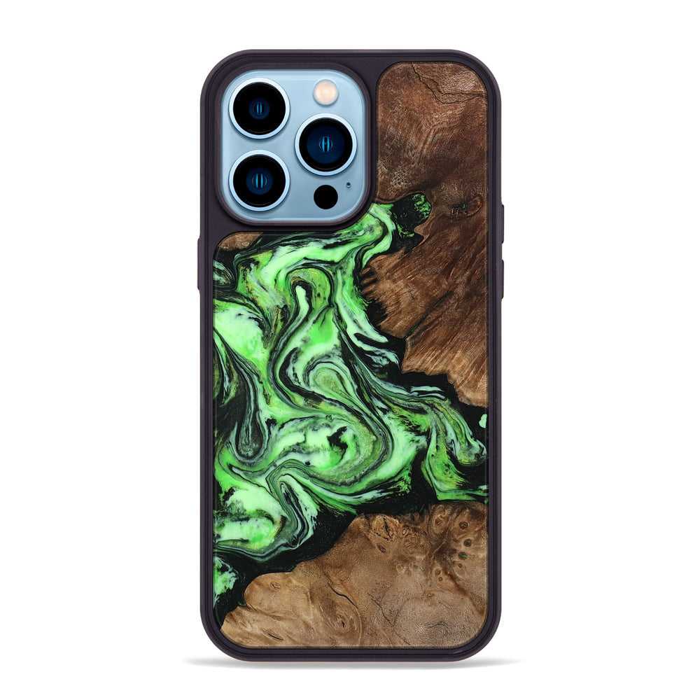 Spencer has a rich, warm Maple wood base with swirling patterns that create a lively design. The vibrant greens and deep blacks contrast beautifully, making it an eye-catching piece of art.