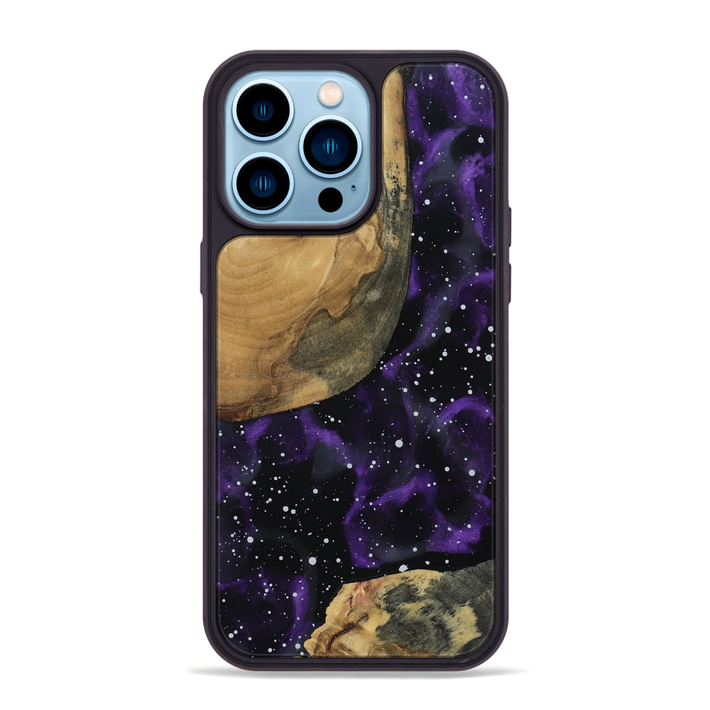 Zahra has beautiful, natural patterns in the rich Buckeye wood, showcasing its smooth texture. The blend of earthy tones and a deep purple background creates a warm yet cosmic feel.