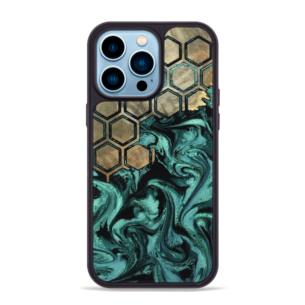 Zariyah features a mix of deep, swirling greens and blacks, creating a calming, fluid effect. It has a pattern of hexagons that adds a unique geometric touch to the natural wood design.