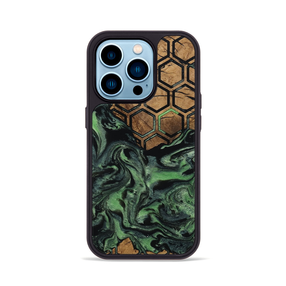 West has a rich Maple wood base featuring a warm, natural tone. It is beautifully paired with a striking hexagon pattern that contrasts with the smooth swirls of green and black.