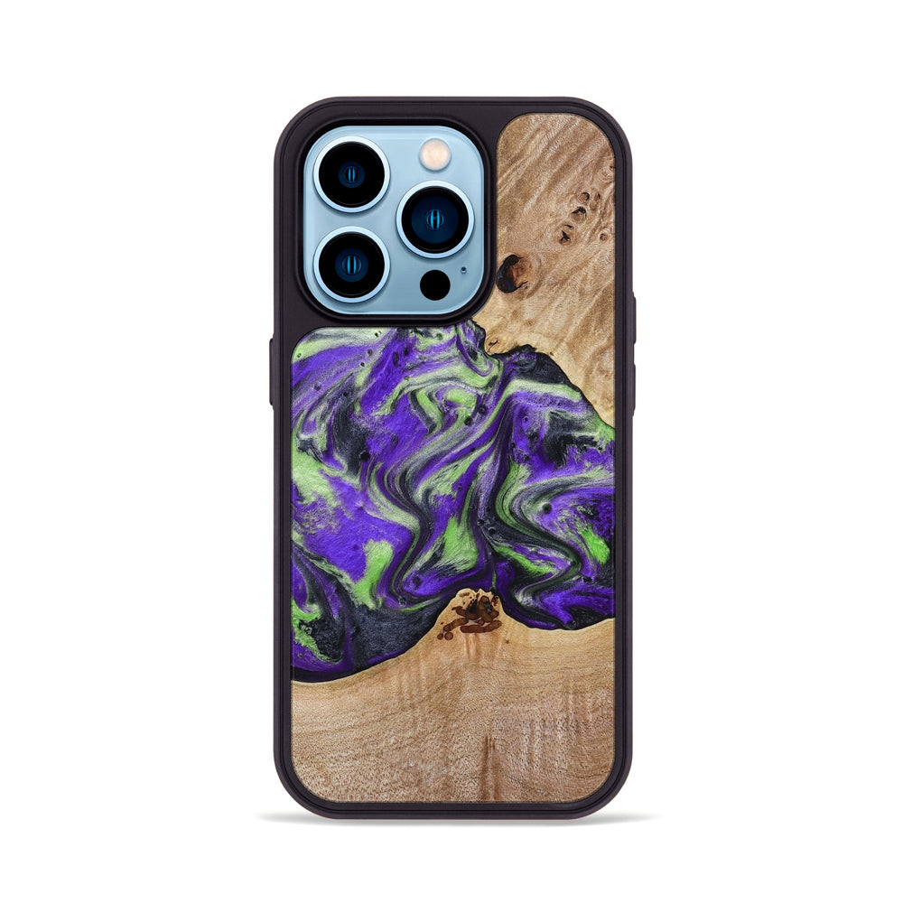 Alpha has a smooth Maple wood surface with a natural grain. It features vibrant swirls of purple and green, creating a dynamic and eye-catching pattern.