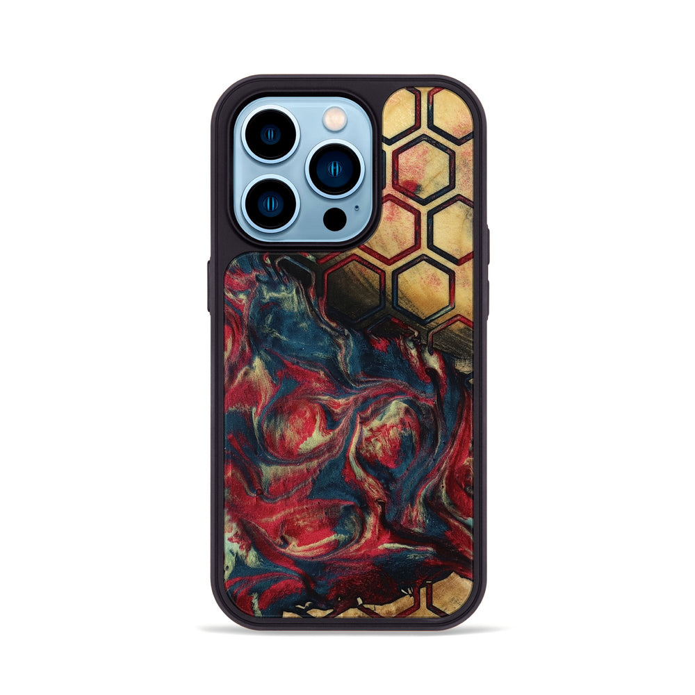 Chante has a beautiful mix of deep reds, blues, and golds swirling together. It features a striking honeycomb pattern that adds a unique touch to the natural wood.