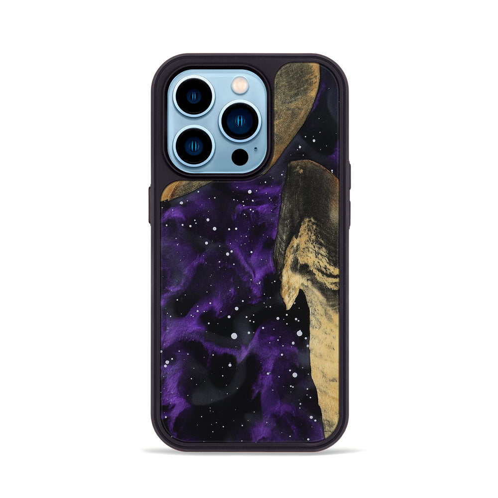 Darwin is a striking piece of Buckeye wood that showcases its natural patterns and textures. The warm tones of the wood contrast beautifully with the cool purple and black background, creating a cosmic feel.