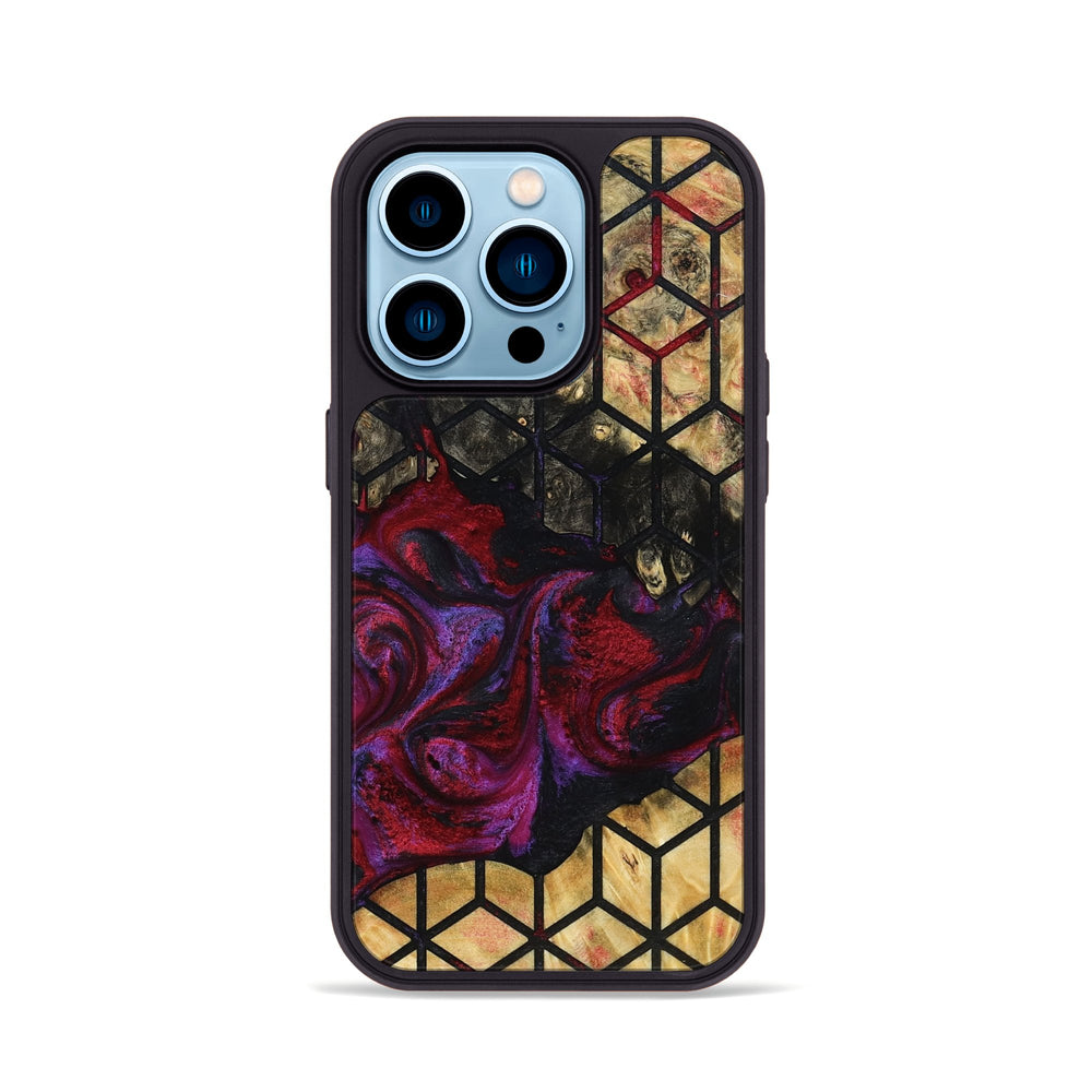 Mike has a warm, golden wood surface with dark patterns that create a striking hexagonal design. Swirls of deep red and purple add a pop of color and depth to the overall look.
