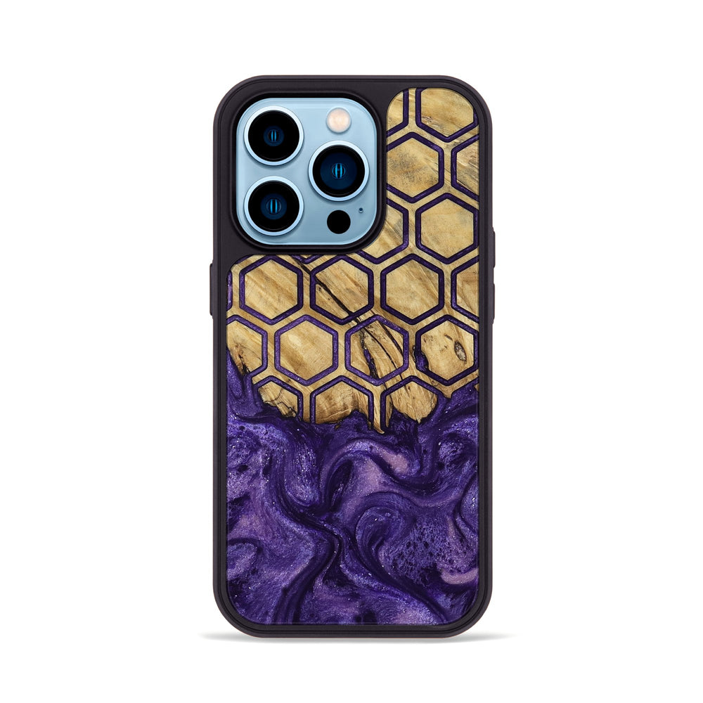 Regan has a unique pattern with honeycomb shapes arranged over a warm, golden wood background. The deep purple swirls at the bottom add a striking contrast, creating a balanced yet intriguing look.