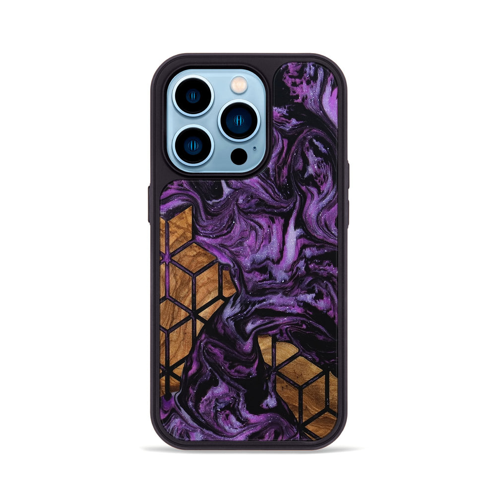 Roselyn has a beautiful mix of swirling purple and black patterns that create a dynamic flow. The Buckeye wood showcases a warm, natural texture, accentuating the vibrant design around a hexagonal pattern.