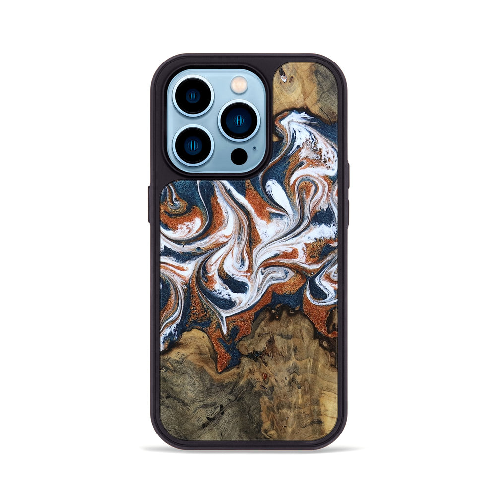 Xzavier has a unique mix of warm browns and striking swirls of white, orange, and blue. The flowing patterns create a beautiful contrast against the natural wood grain.