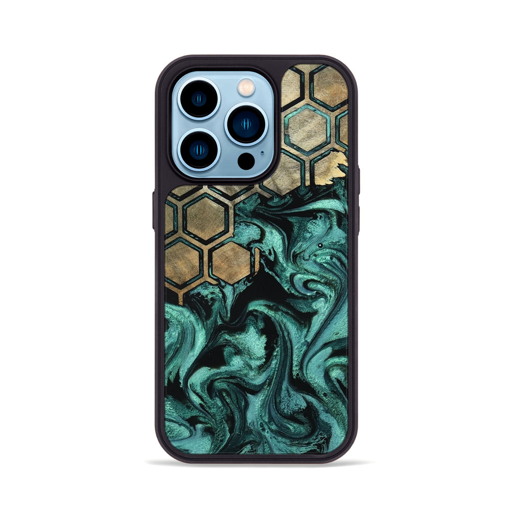 Zariyah features a mix of deep, swirling greens and blacks, creating a calming, fluid effect. It has a pattern of hexagons that adds a unique geometric touch to the natural wood design.