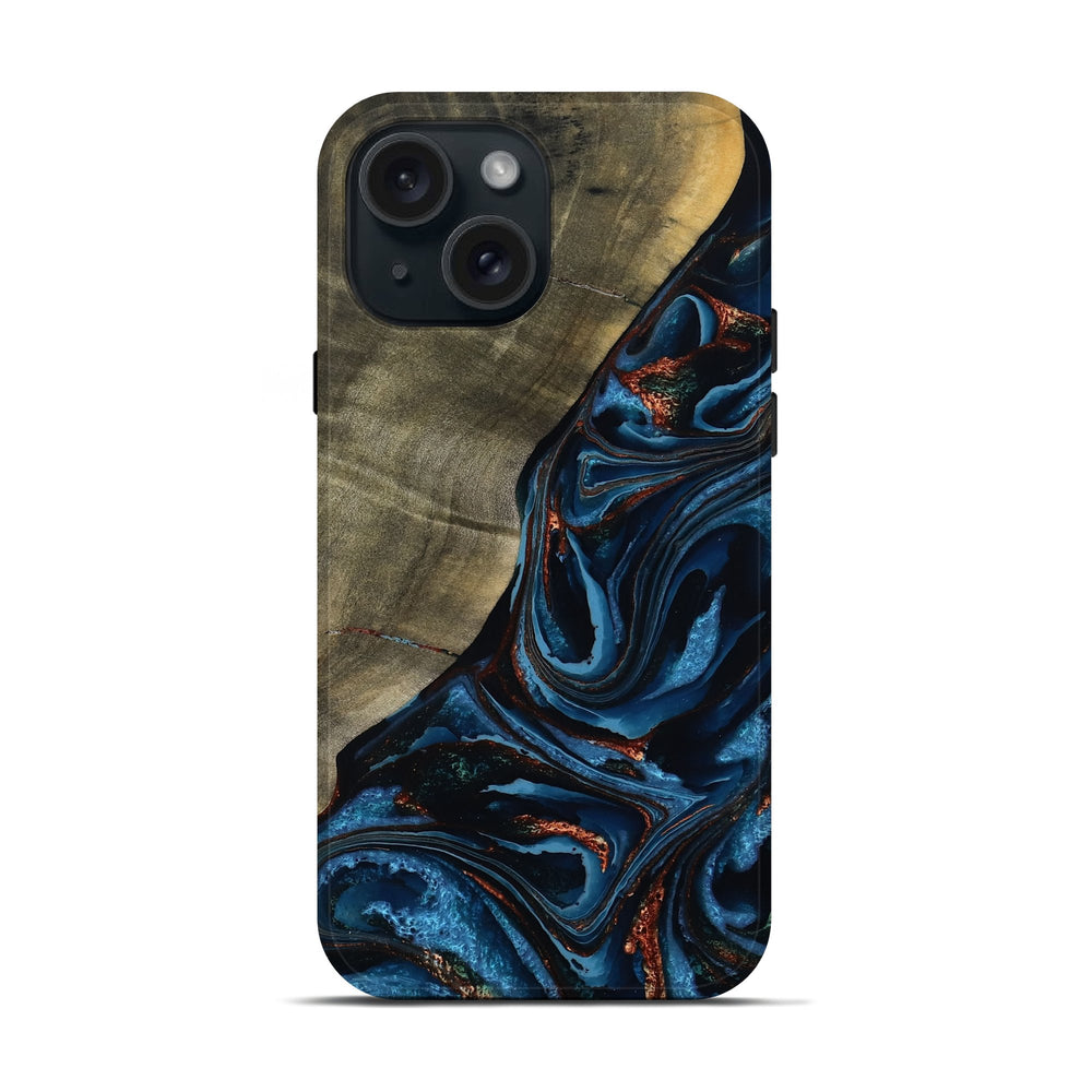 Our Live Edge cases are made from an amazing combination of stabilized wood burl and colored resin. Our stabilization process hardens the wood to protect against cracks and breaks. We do every step of the process at our shop in Northern Indiana. Perfectly fits the iPhone 15.