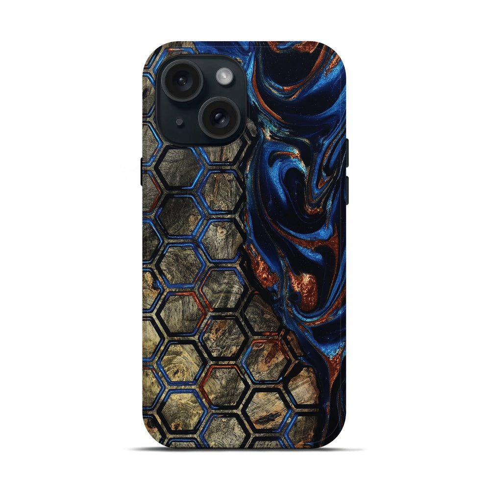 Our Live Edge cases are made from an amazing combination of stabilized wood burl and colored resin. Our stabilization process hardens the wood to protect against cracks and breaks. We do every step of the process at our shop in Northern Indiana. Perfectly fits the iPhone 15.