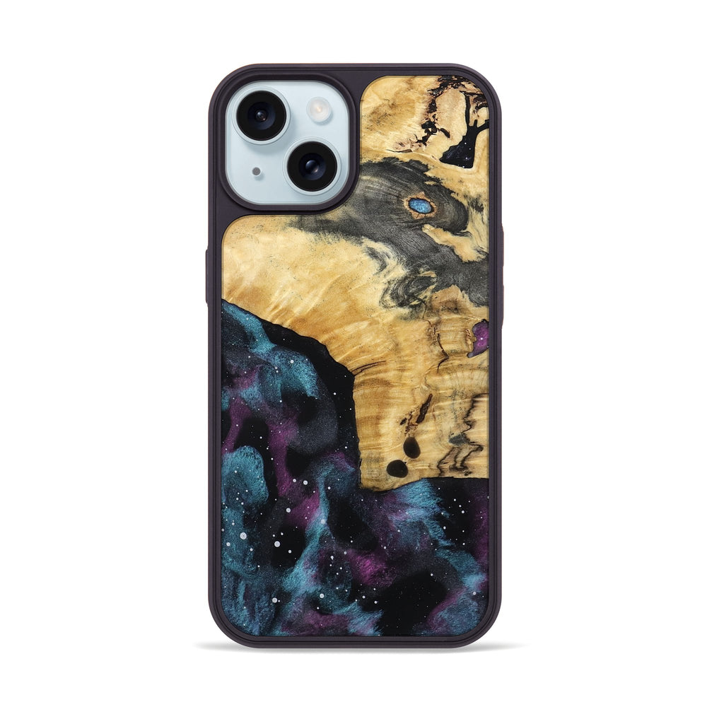 Emerie has a stunning mix of warm, golden wood tones, highlighted by dark, wavy patterns. The wood is set against a vibrant backdrop of blues and purples, creating a cosmic feel.
