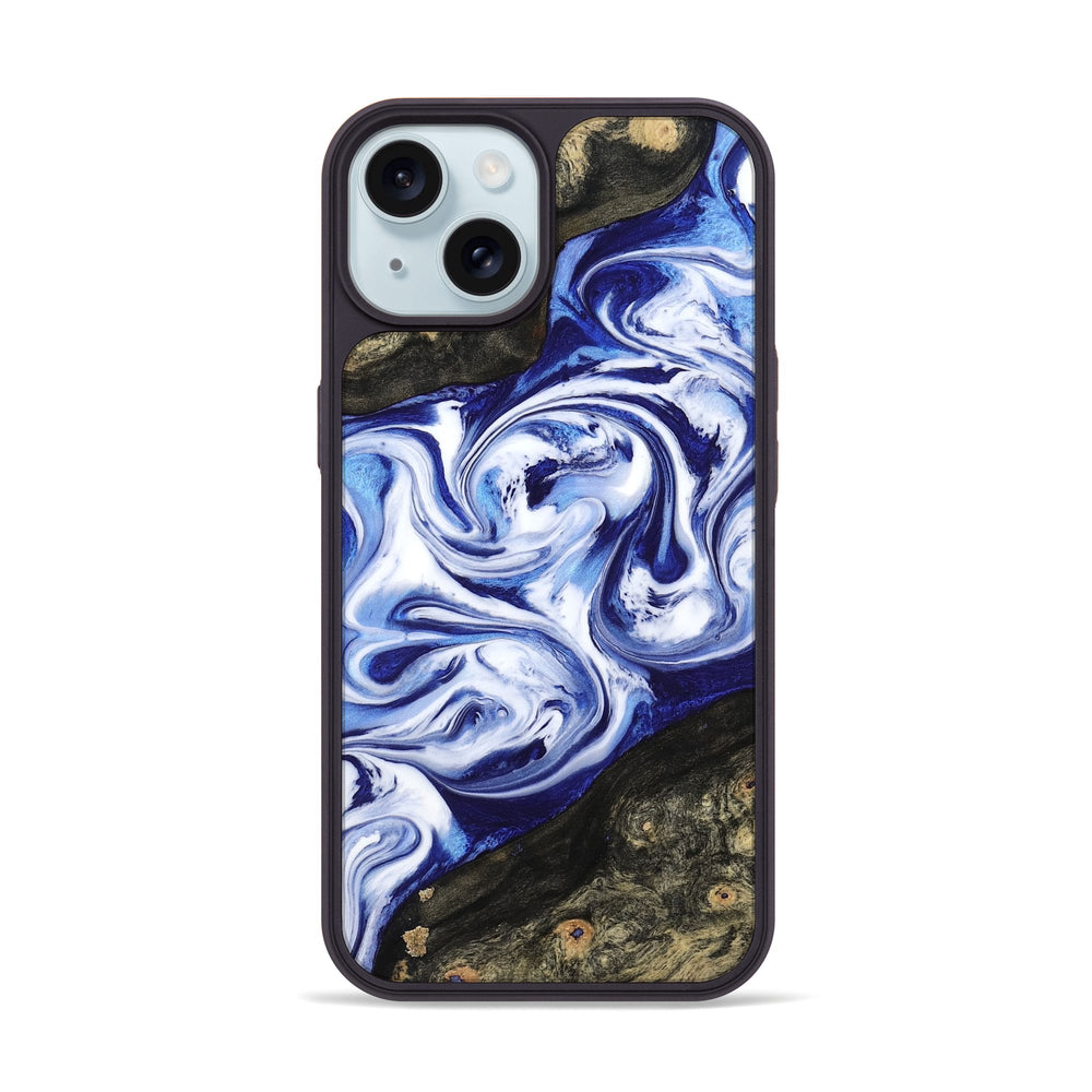 Olaf has rich, dark wood tones that contrast beautifully with swirling shades of blue and white. The gentle patterns create a tranquil, flowing appearance, inviting a sense of calm.