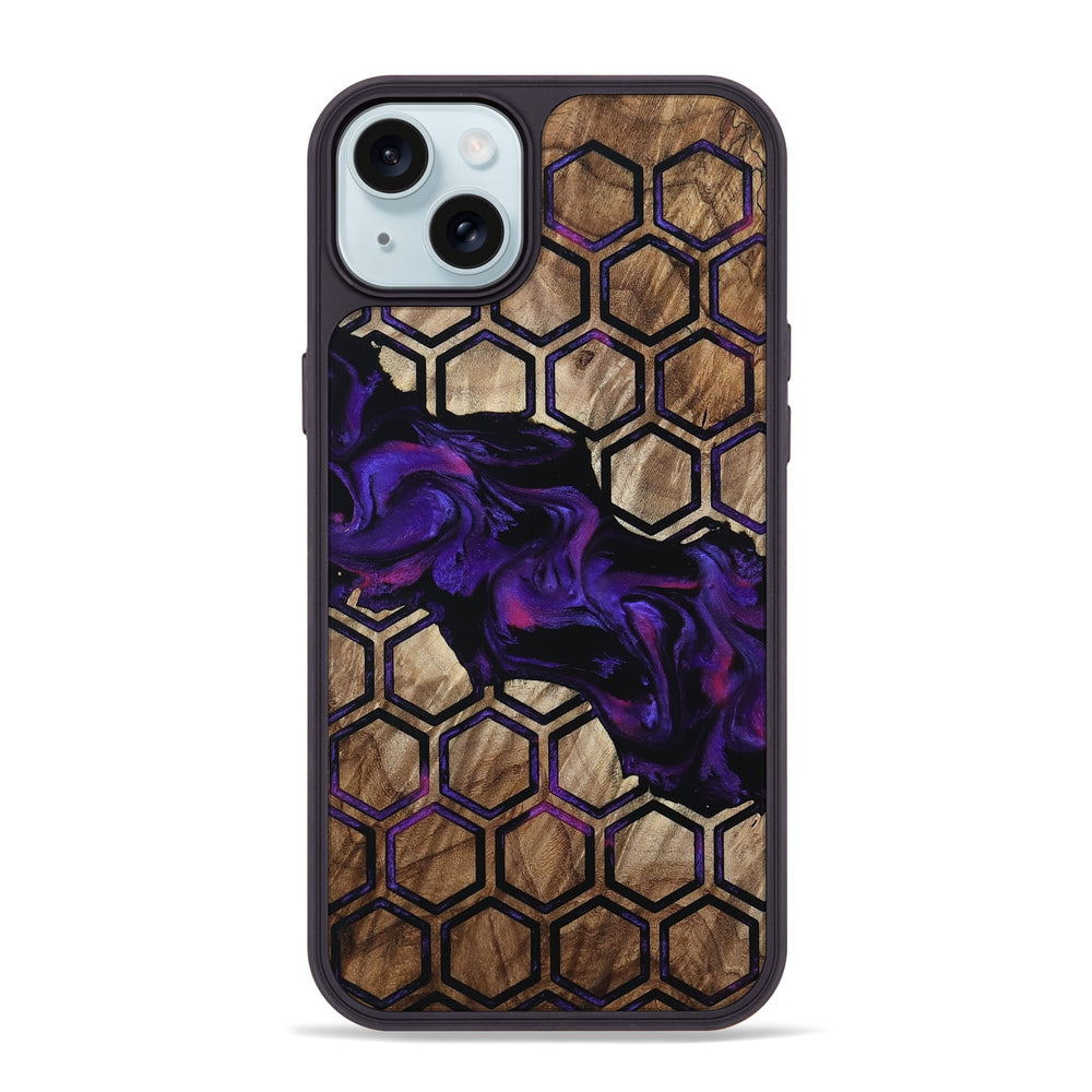 Ashtyn has a beautiful mix of warm maple wood tones and vivid purple swirls. Its hexagonal pattern adds a modern touch to the natural wood background.