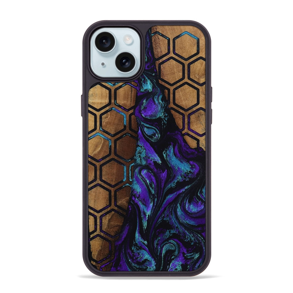 Johnson has rich, warm tones of maple wood, enhanced by a striking pattern of swirling purple and blue. The hexagonal shapes in the background add a unique touch, creating an interesting blend of natural and artistic elements.