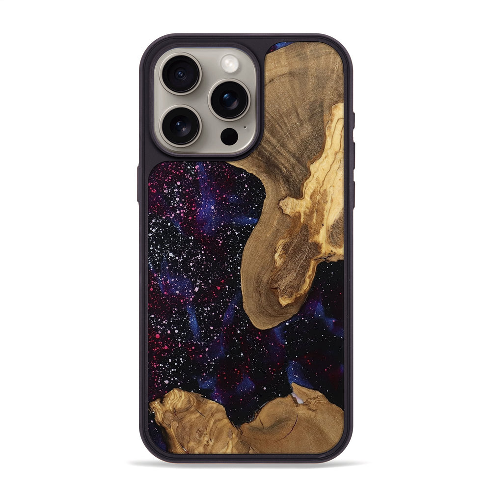 Glenna has beautiful olive wood with a rich, warm texture. It features a cosmic backdrop of deep blues and purples, creating a striking contrast.
