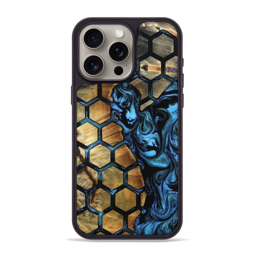 Elliana has beautiful Buckeye wood with warm, natural tones. It features a unique hexagonal pattern that adds a bold contrast to the swirled blue background.