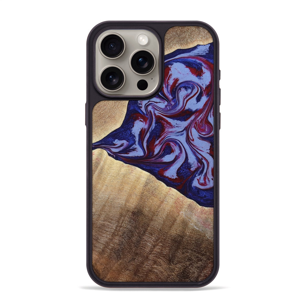 Angie has a beautiful blend of deep blues and rich reds, swirling together in a smooth design. The maple wood features a warm, golden backdrop that adds a lovely contrast.