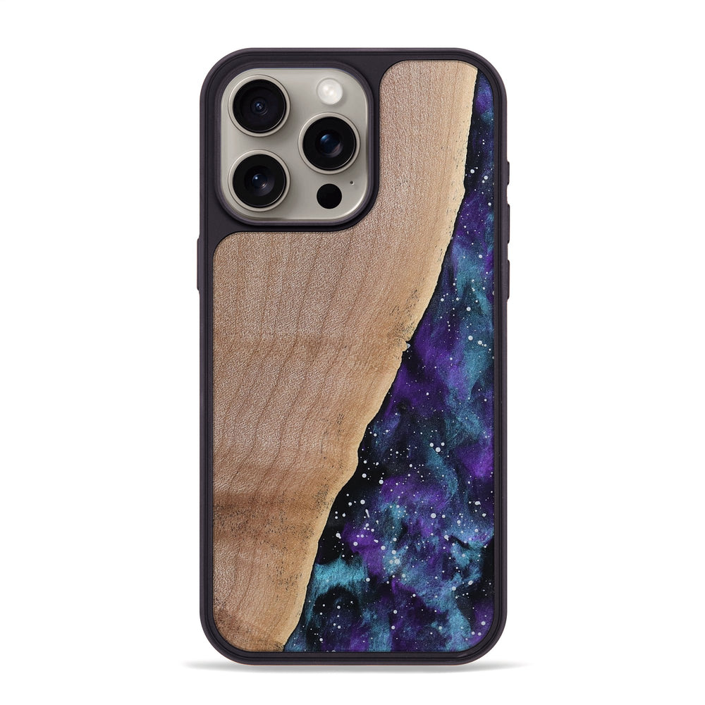 Aryan features smooth Maple wood with gentle curves and a light, warm hue. Its surface contrasts beautifully with a dark, swirling background of purple and blue, creating a stunning visual flow.