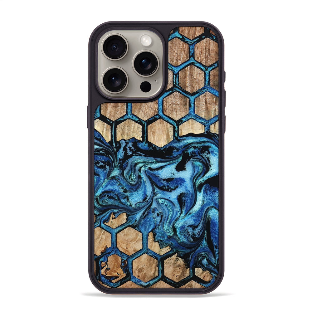 Camille has a warm, natural beauty with honey-colored Maple wood. It features a striking pattern of hexagons, complemented by swirling shades of blue and black.