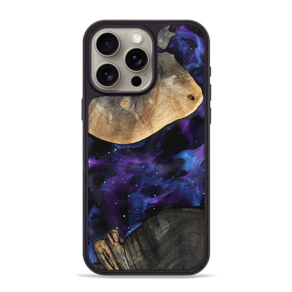 Elda is a striking piece of Buckeye wood with shades of brown and natural patterns. It features a vibrant, swirling backdrop of deep purples and blues that creates a cosmic feel.