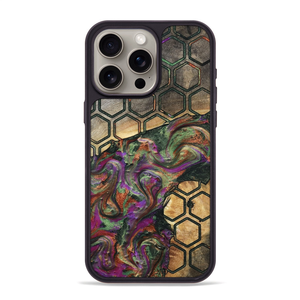 Jaelyn has a rich, colorful swirl pattern that blends vibrant greens, purples, and golds. The background features a striking honeycomb design that adds a unique texture to the piece.
