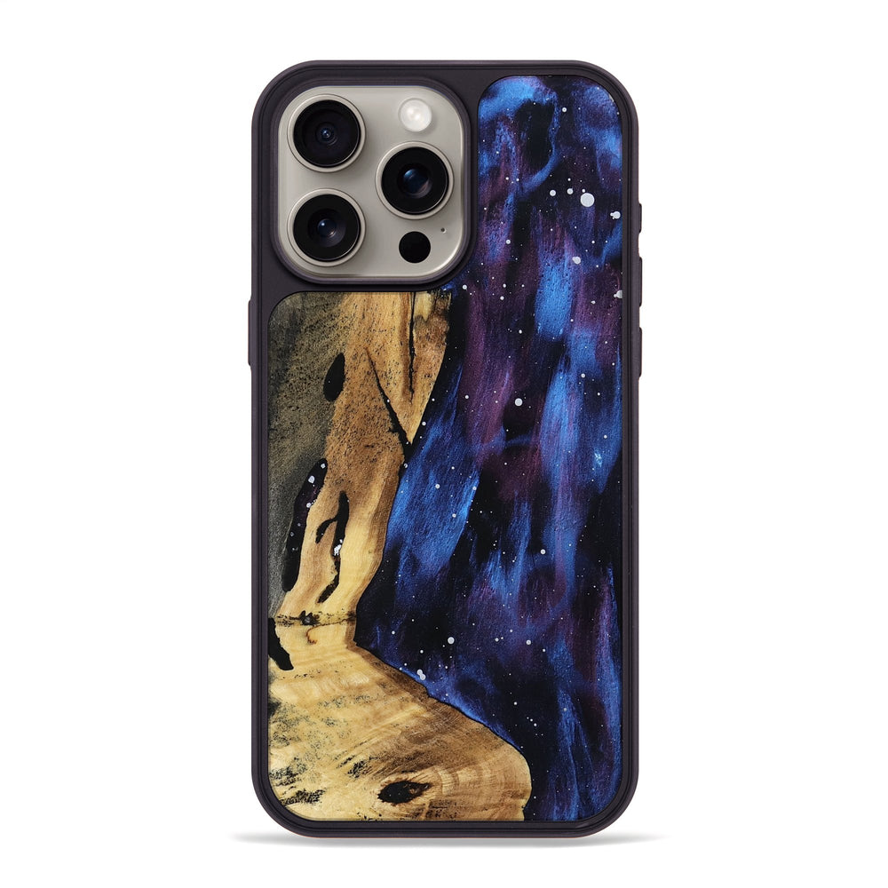 Mindi features a warm, natural wood grain that highlights its organic beauty. It has a striking contrast with deep blues and purples, creating a cosmic feel.