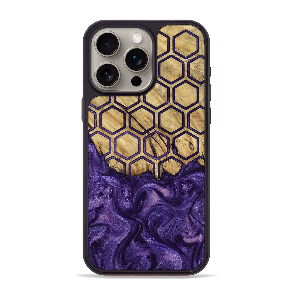 Regan has a unique pattern with honeycomb shapes arranged over a warm, golden wood background. The deep purple swirls at the bottom add a striking contrast, creating a balanced yet intriguing look.