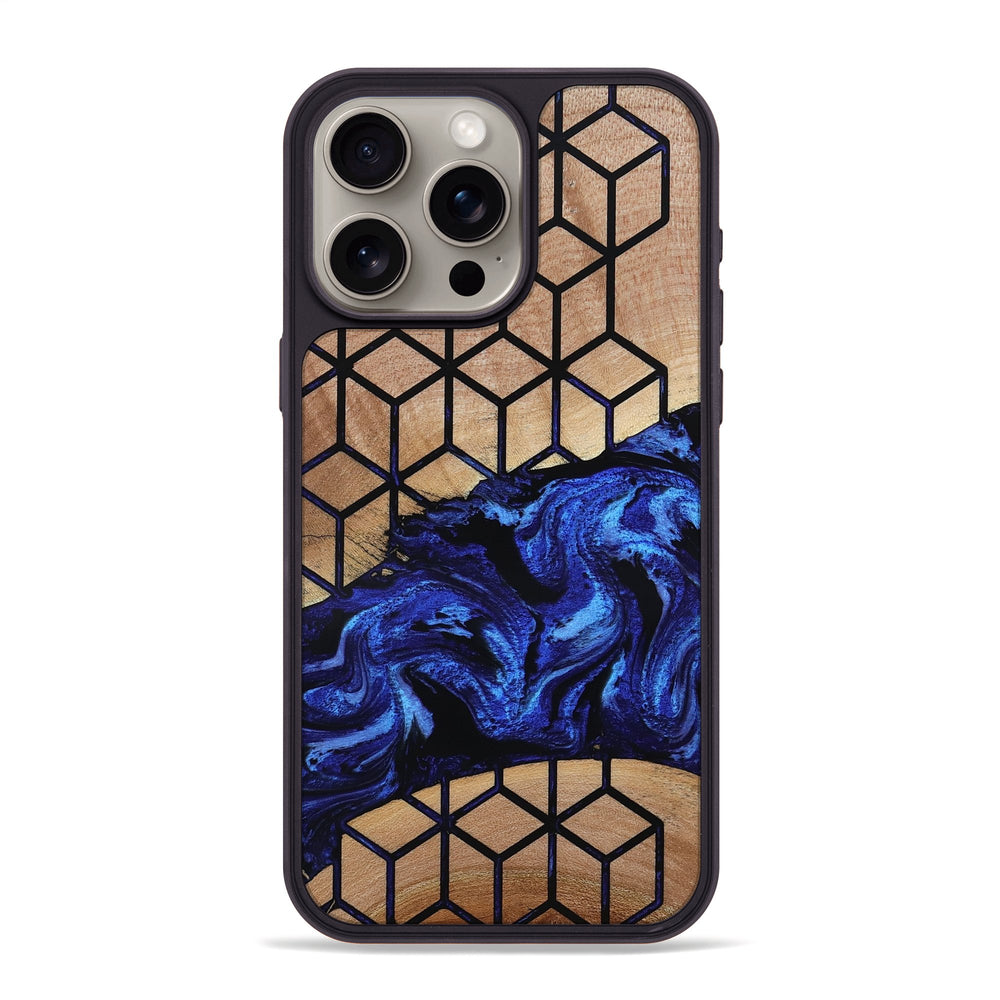 Tucker has a warm, natural look with smooth maple wood that showcases its rich grain. It features a geometric pattern of black cubes layered over swirls of deep blue, creating a striking contrast.