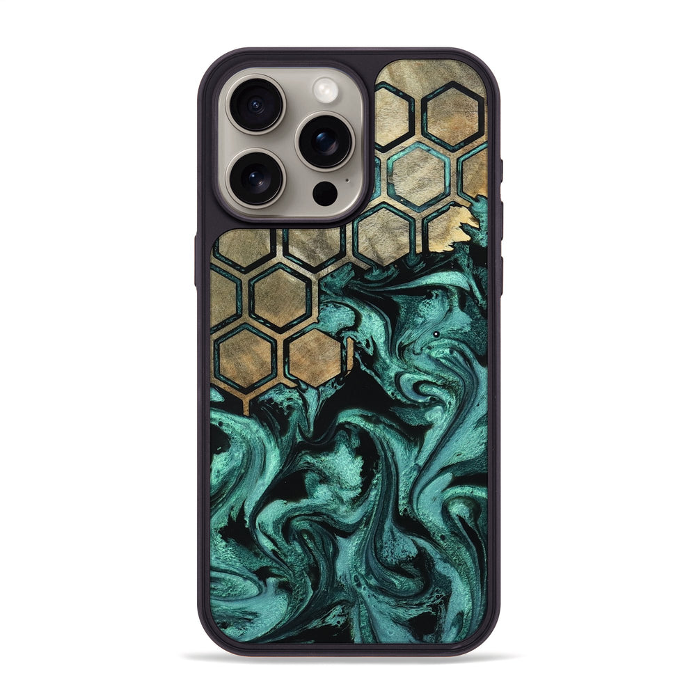 Zariyah features a mix of deep, swirling greens and blacks, creating a calming, fluid effect. It has a pattern of hexagons that adds a unique geometric touch to the natural wood design.