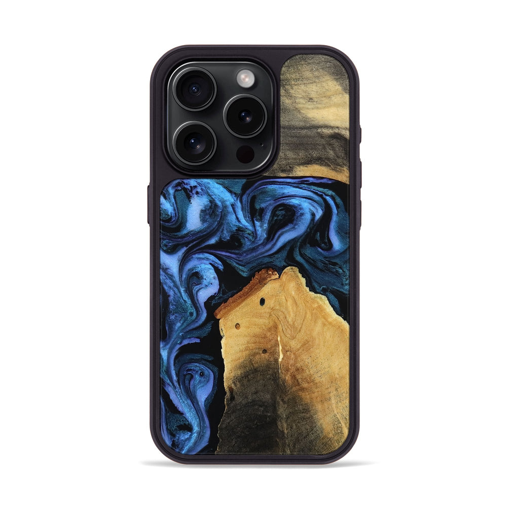 Akeem has beautiful swirling patterns in shades of blue and black. Its warm, natural wood grains create a striking contrast with the vibrant colors.