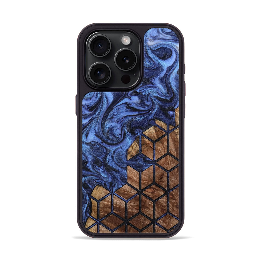 Arleen has beautiful Maple wood with rich, warm tones. It features a striking geometric pattern that contrasts nicely with the flowing, deep blue background.