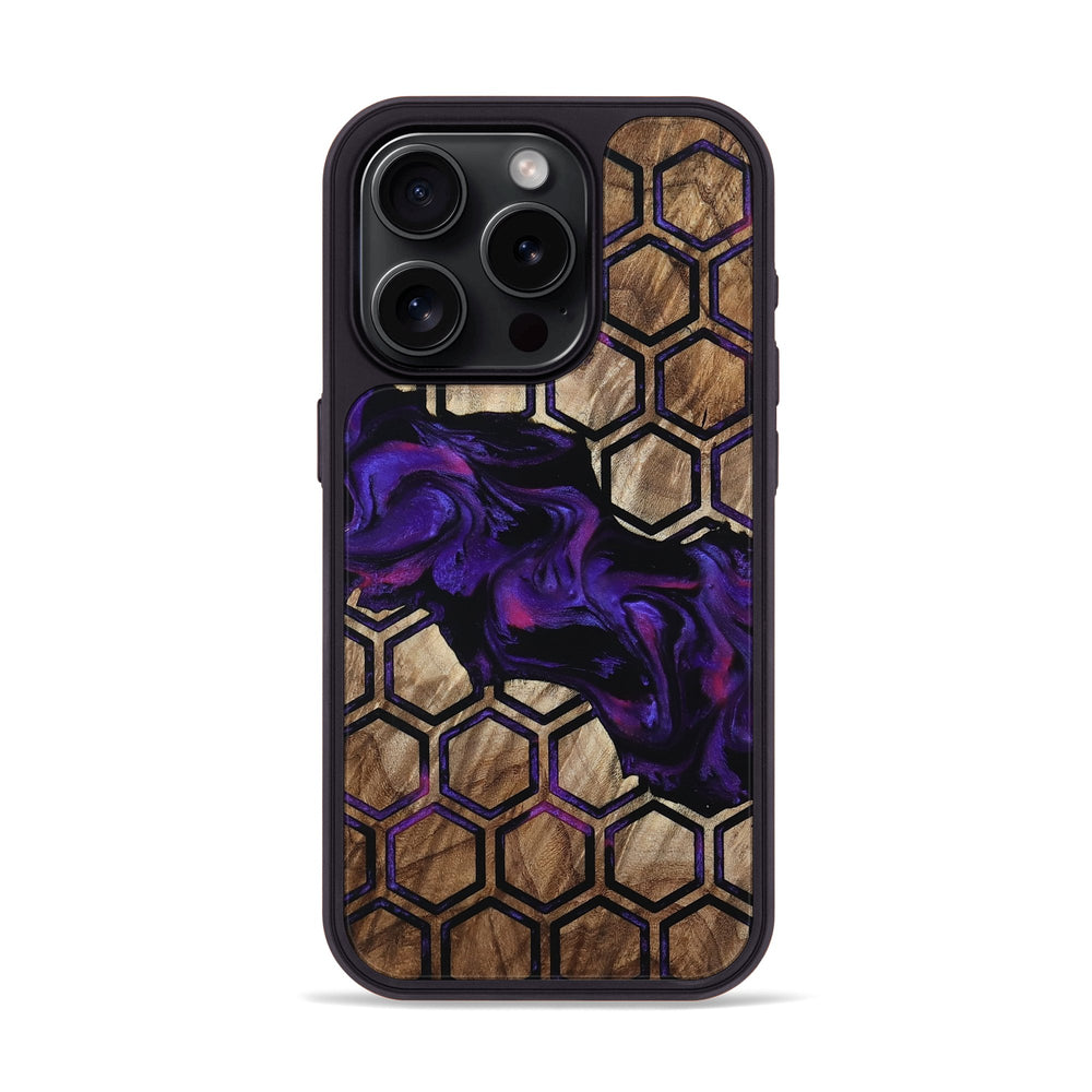 Ashtyn has a beautiful mix of warm maple wood tones and vivid purple swirls. Its hexagonal pattern adds a modern touch to the natural wood background.