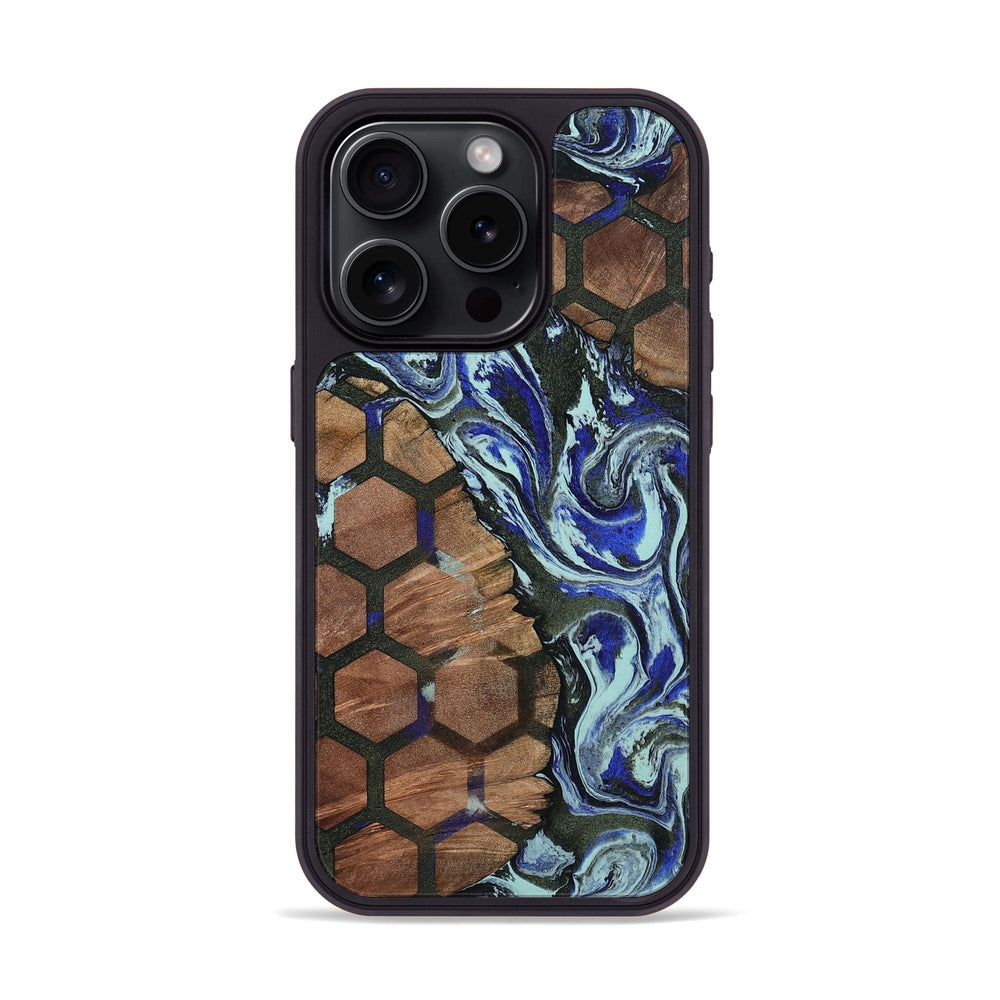 Benicio is made of warm Maple wood, showcasing a honeycomb pattern that blends beautifully with swirling blue and white designs. Its rich, natural tones create a stunning contrast, making it a captivating piece of art.