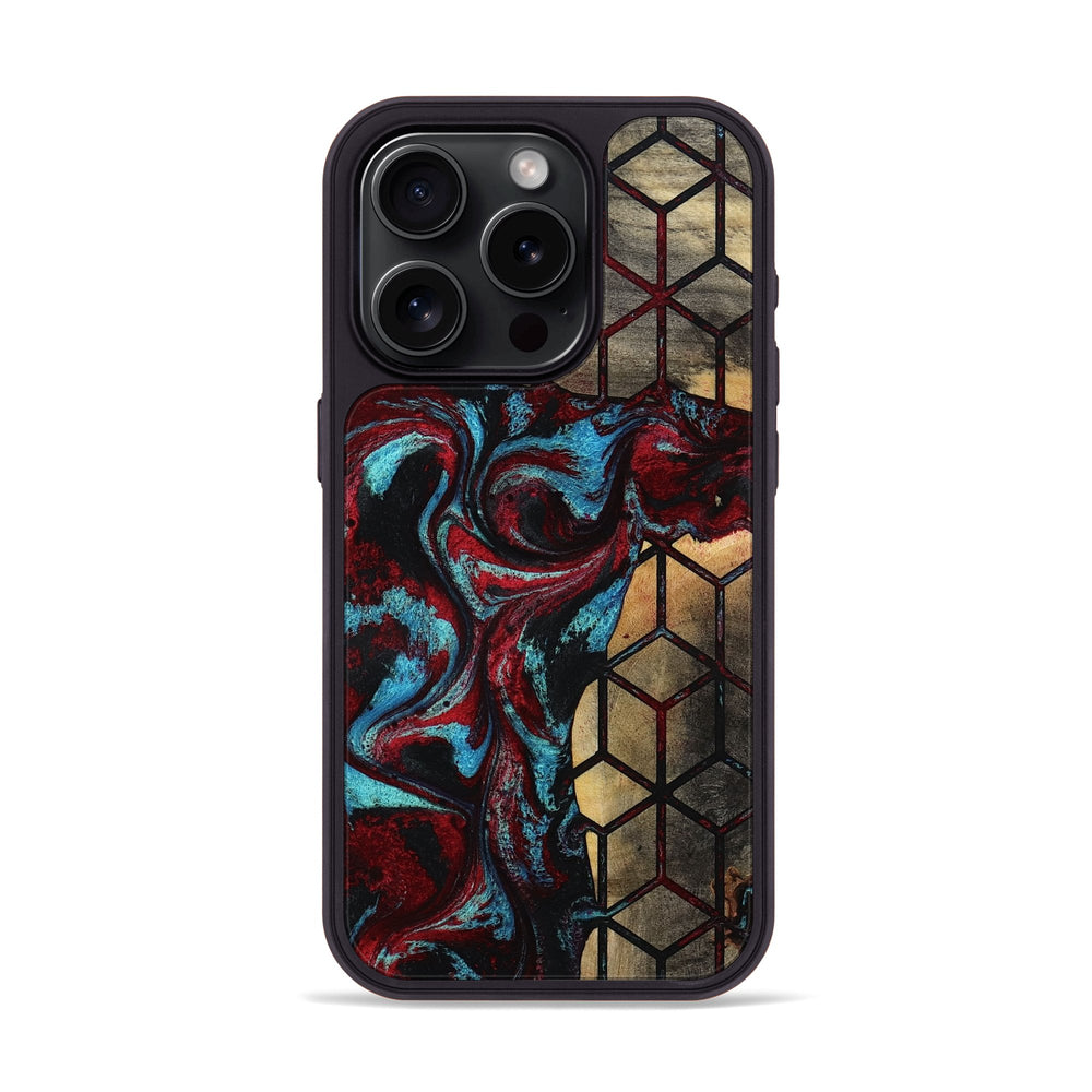 Casimer has a striking blend of deep reds and blues swirling against a backdrop of warm wood tones. The pattern of hexagons adds a playful touch, enhancing its unique visual appeal.