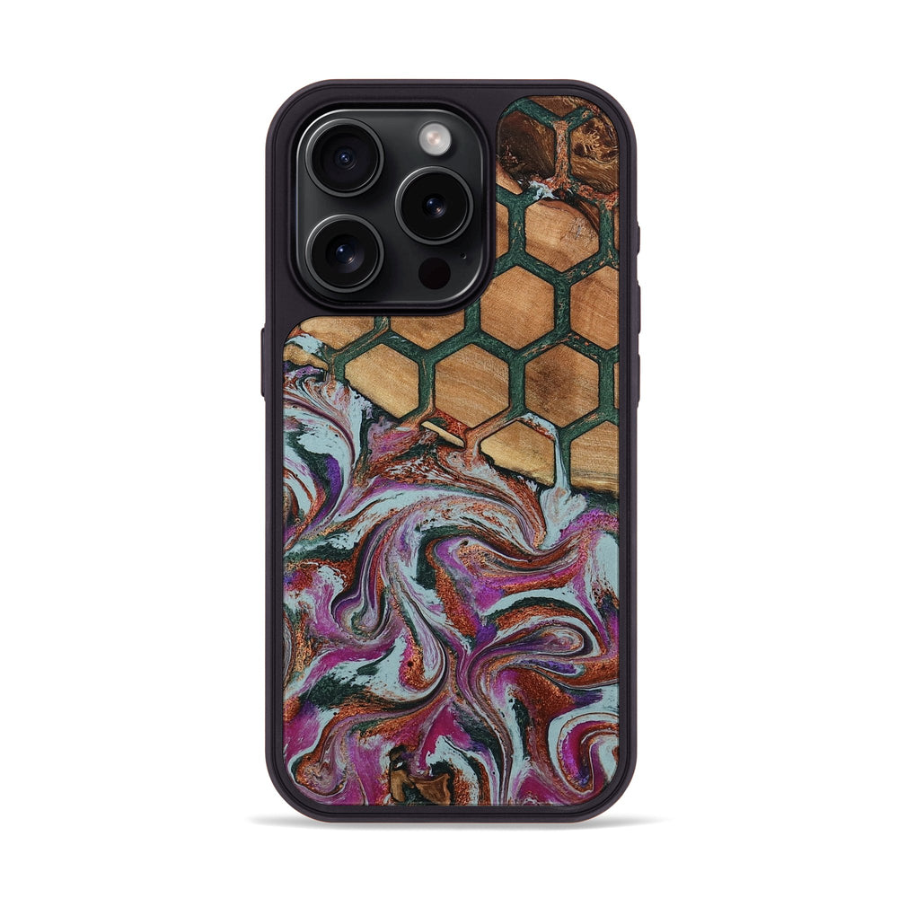 Fallon features a rich Maple wood with a warm, natural tone. Its design showcases a striking honeycomb pattern, beautifully contrasting with swirls of vibrant colors below.