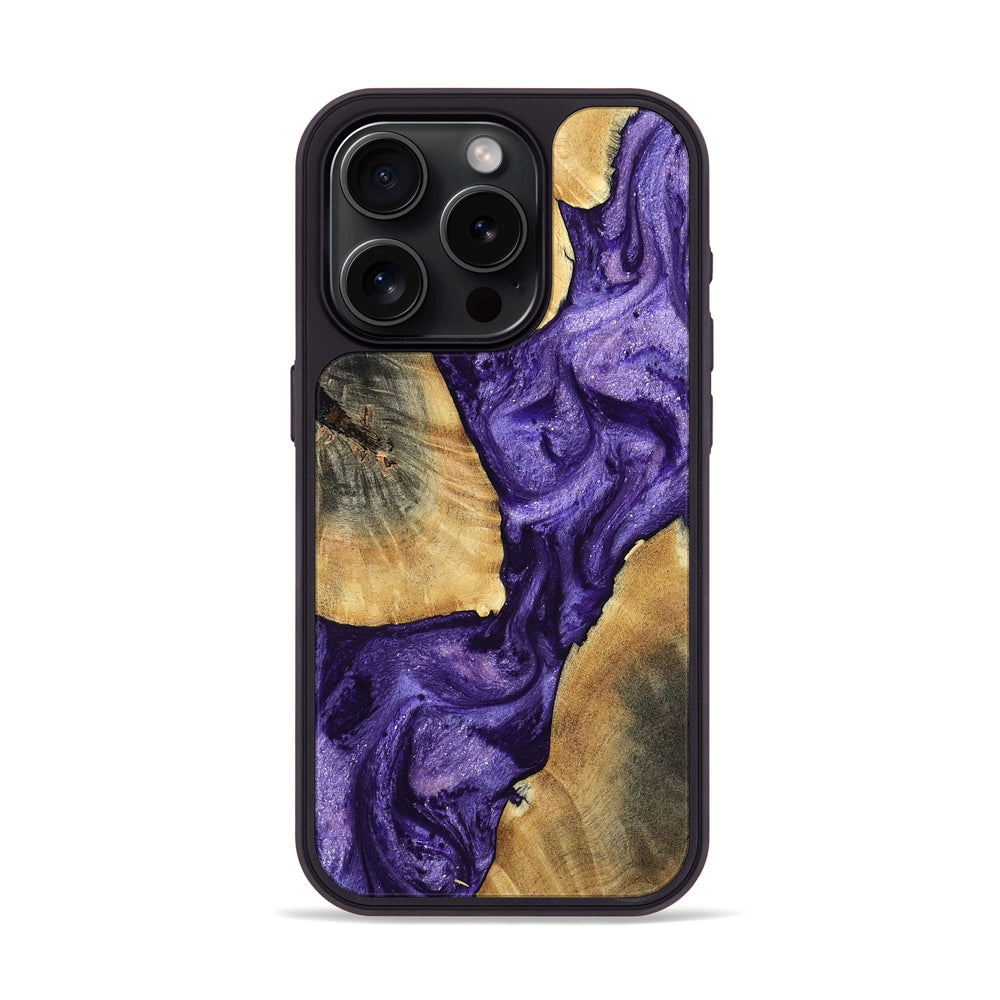 Mariel has a striking blend of warm wood tones and a deep, rich purple pattern. The swirling shapes create a beautiful contrast, making it unique and eye-catching.