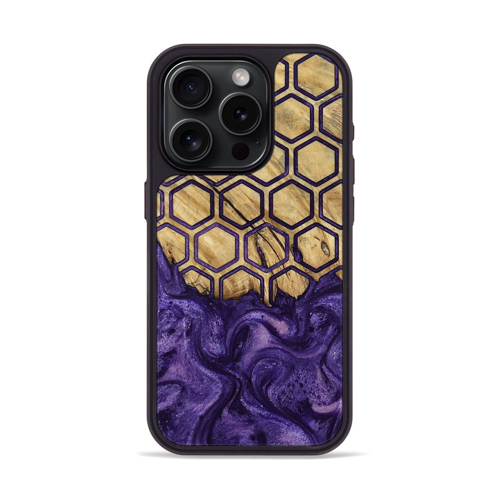 Regan has a unique pattern with honeycomb shapes arranged over a warm, golden wood background. The deep purple swirls at the bottom add a striking contrast, creating a balanced yet intriguing look.