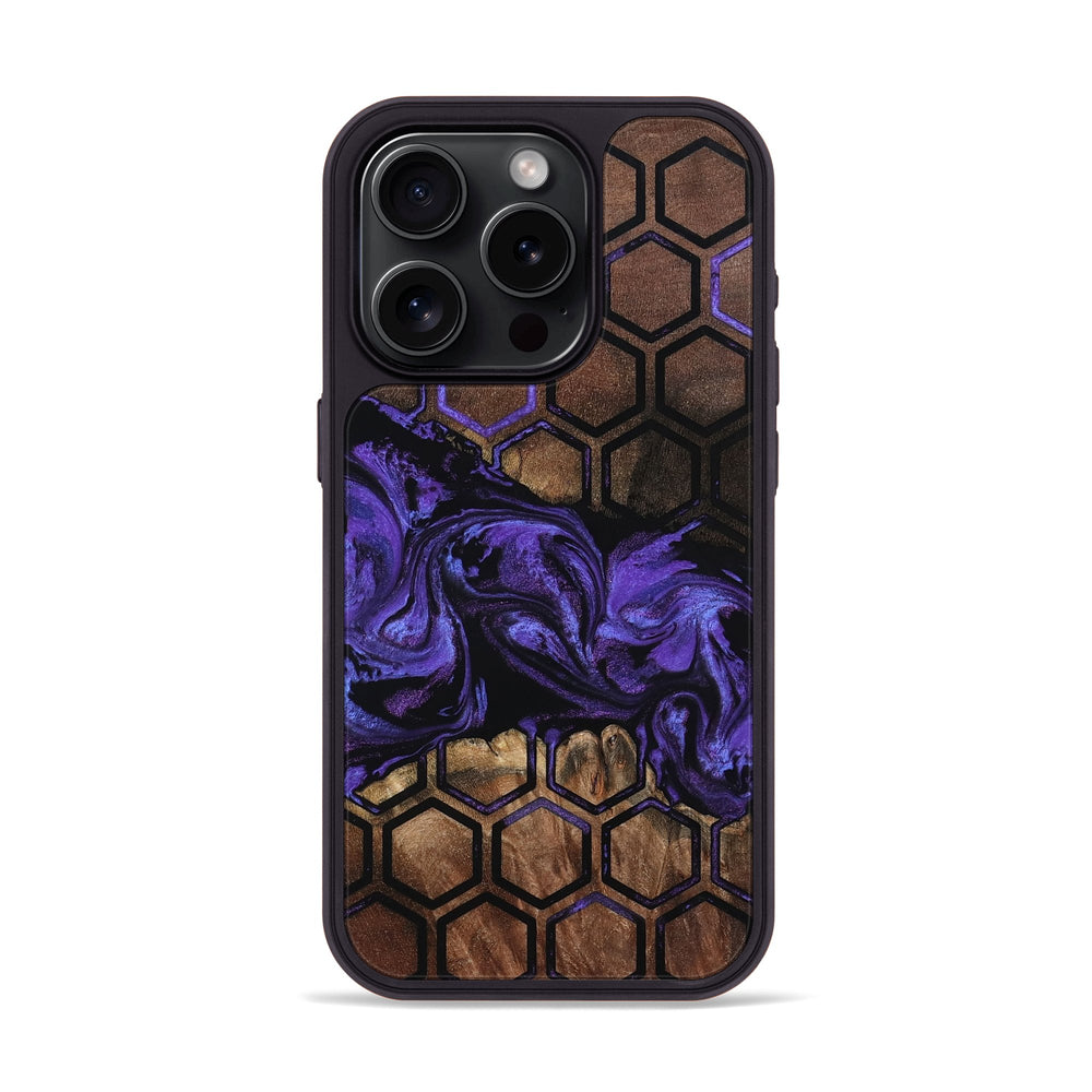 Theresa has a smooth maple wood surface with a warm, rich tone. It features a striking pattern of hexagons, paired with swirls of purple and gold that add a vibrant touch.