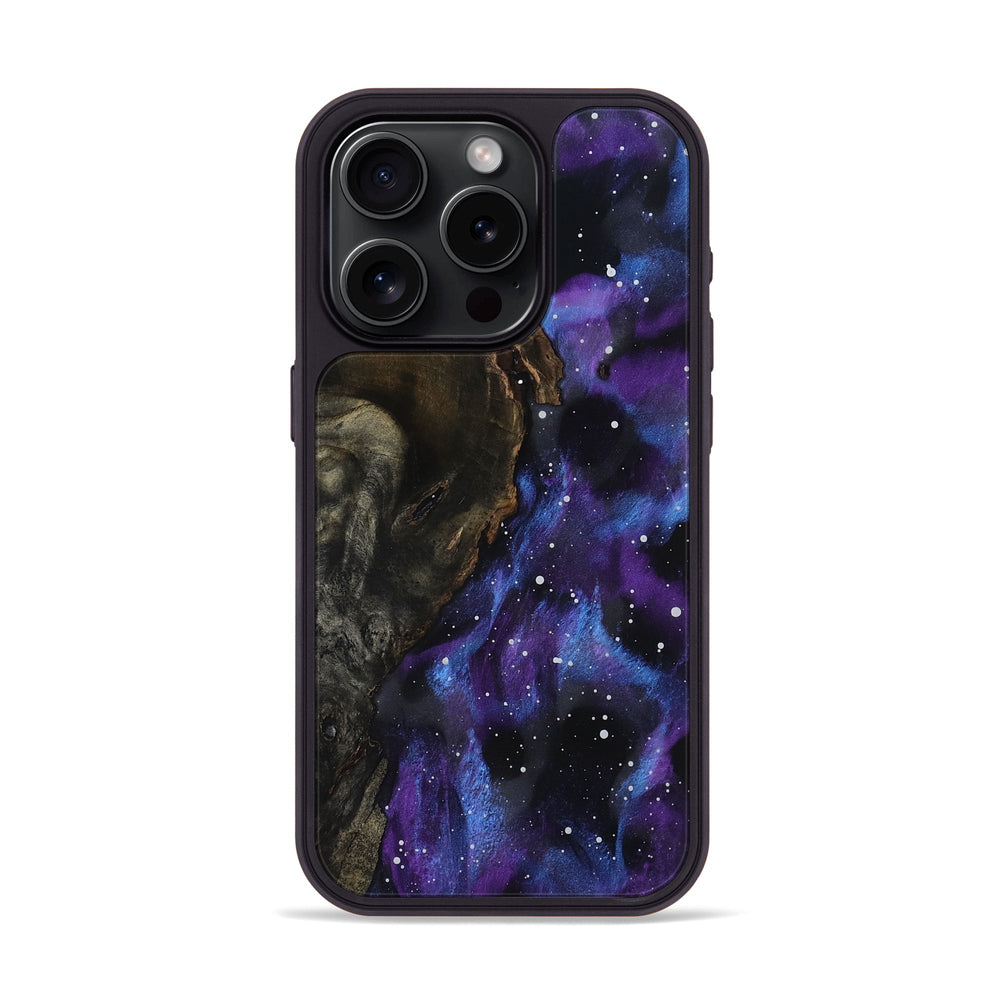 Will has a rich, dark wood grain that showcases its natural beauty. Soft shades of purple and blue swirl around, creating a cosmic effect that draws the eye.