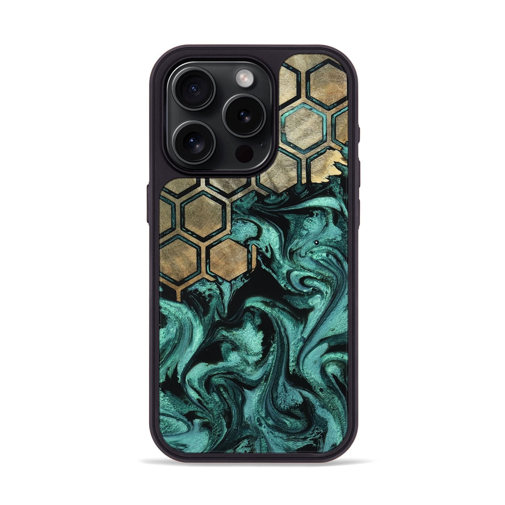 Zariyah features a mix of deep, swirling greens and blacks, creating a calming, fluid effect. It has a pattern of hexagons that adds a unique geometric touch to the natural wood design.
