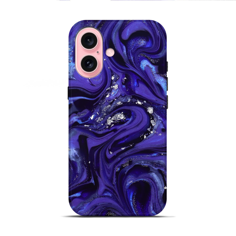 Kyree has deep purple and swirling blue tones that blend beautifully together. It features silver flakes scattered throughout, adding a touch of sparkle.