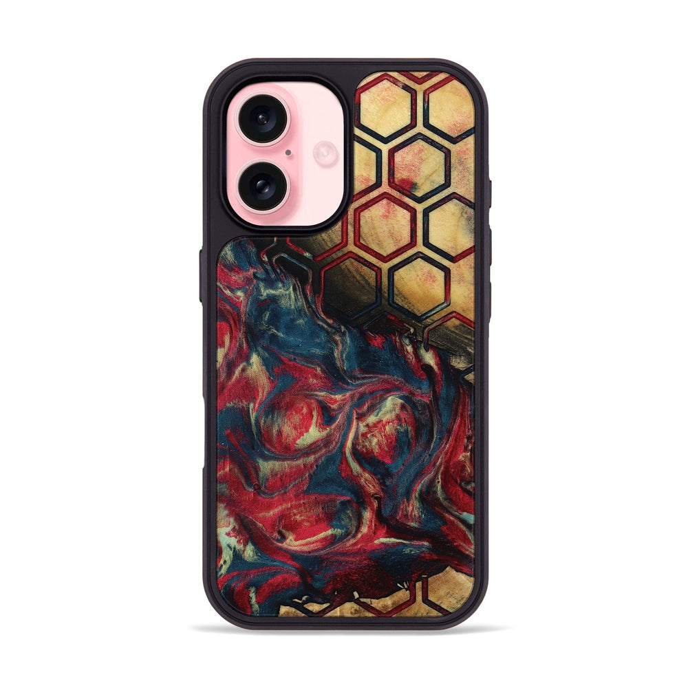 Chante has a beautiful mix of deep reds, blues, and golds swirling together. It features a striking honeycomb pattern that adds a unique touch to the natural wood.