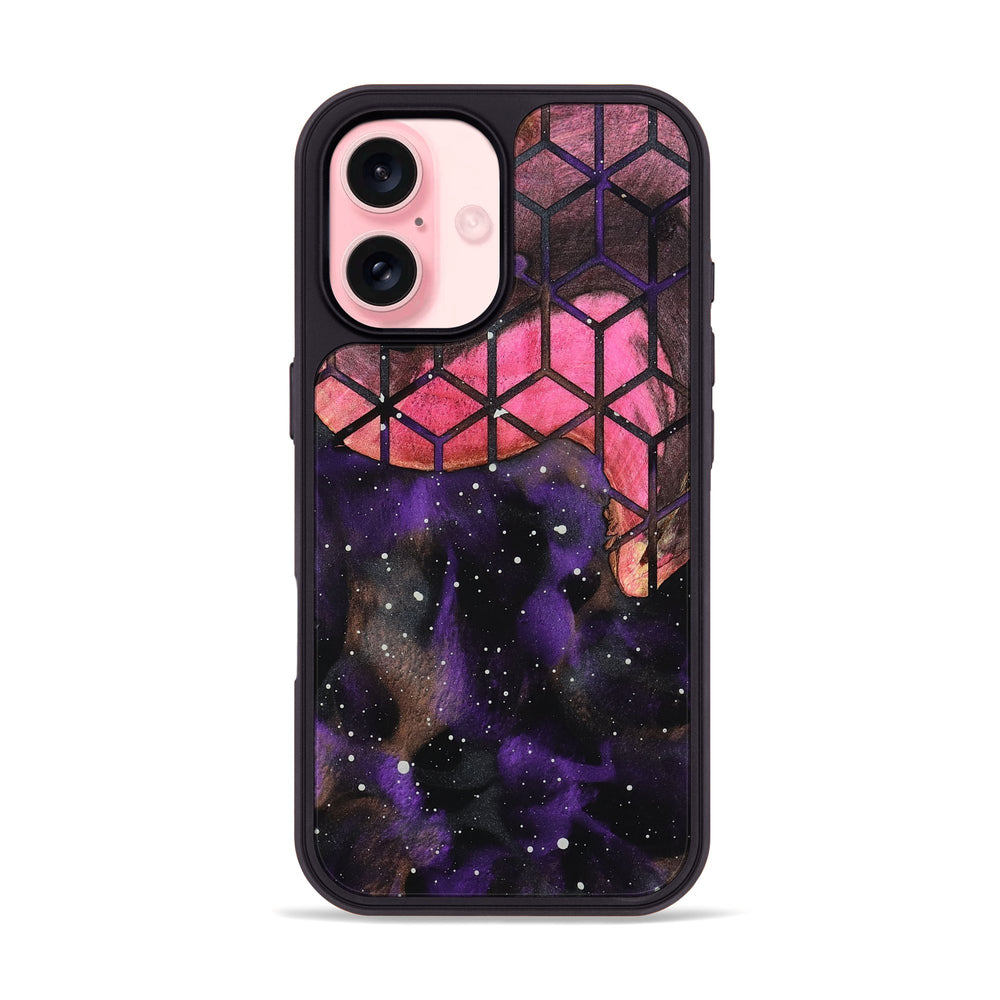 Pete is a vibrant piece of dyed wood featuring a mix of deep purples and pinks. It has a honeycomb pattern overlay that adds an interesting texture to its cosmic design.