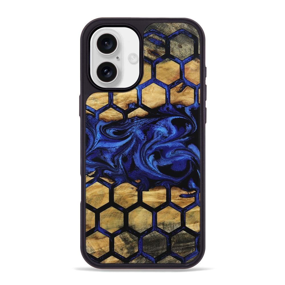 Nyah has a warm, natural look with rich shades of gold and brown in its Buckeye wood. It features a striking honeycomb pattern in a vibrant blue, adding a unique and modern touch.