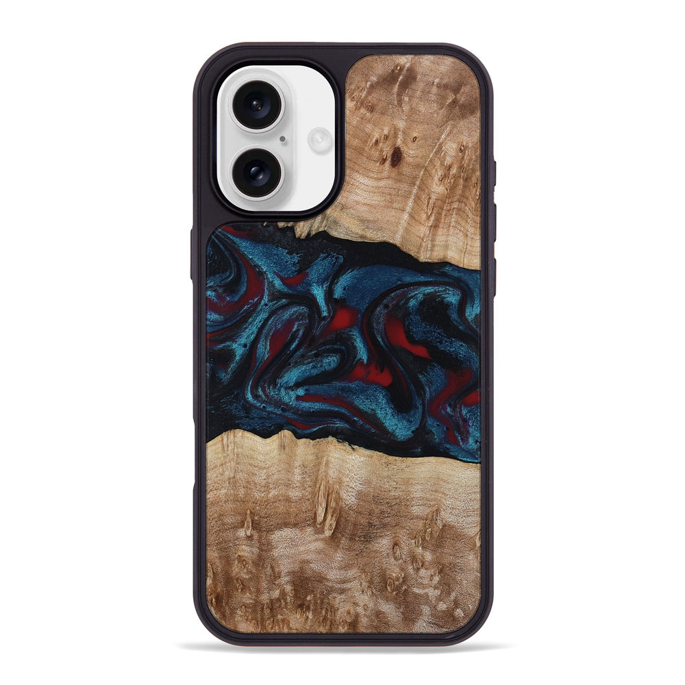 Rhea has a warm, natural Maple wood surface with soft swirls and a smooth finish. It features a striking contrast of deep blue and red patterns that create a lively flow across the wood grain.