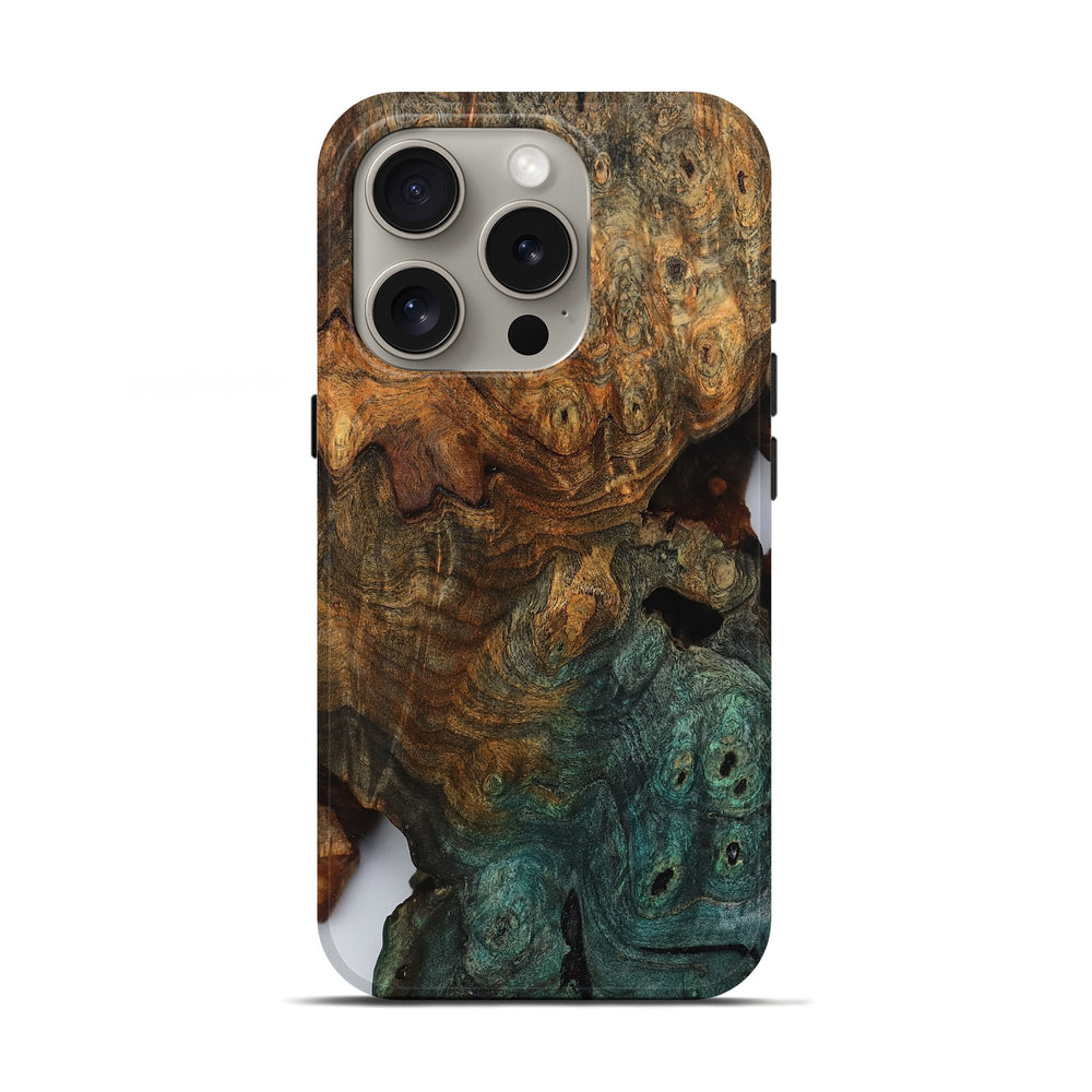 Our Live Edge cases are made from an amazing combination of stabilized wood burl and colored resin. Our stabilization process hardens the wood to protect against cracks and breaks. We do every step of the process at our shop in Northern Indiana. Perfectly fits the iPhone 16 Pro.