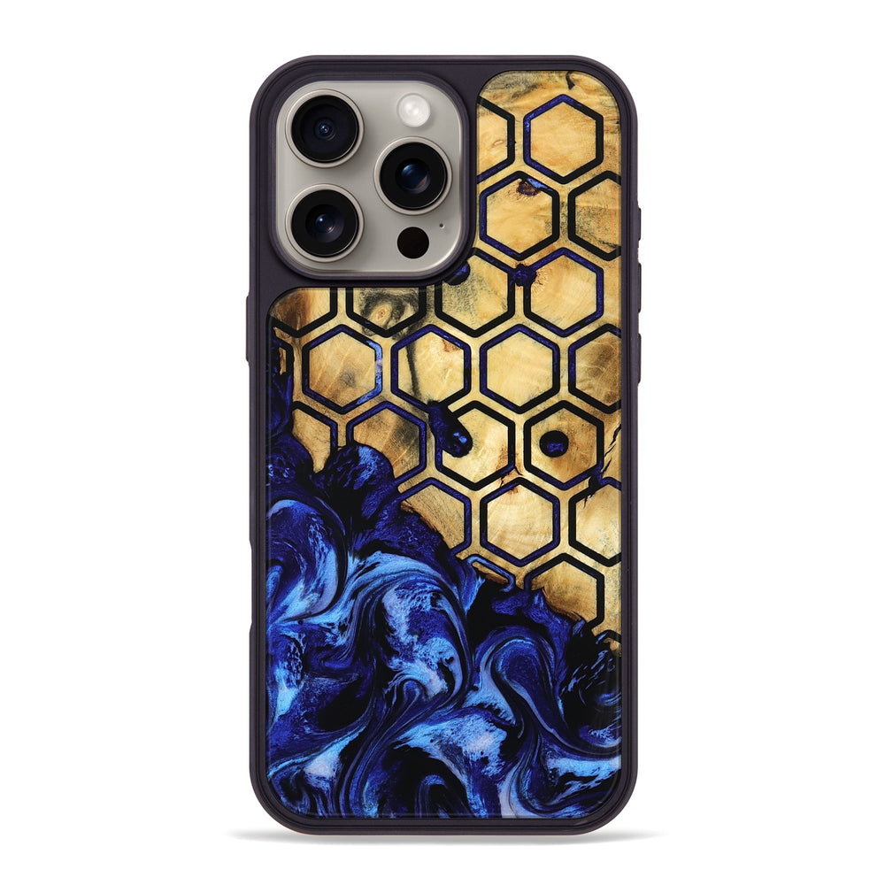 Emilie has a warm wood finish with beautiful swirls of deep blue and gold. The pattern of hexagons creates a striking contrast against the flowing colors, giving it a unique and lively look.