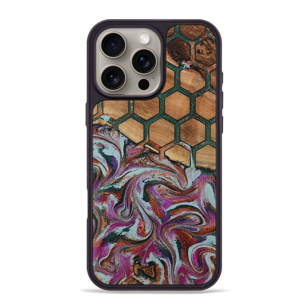 Fallon features a rich Maple wood with a warm, natural tone. Its design showcases a striking honeycomb pattern, beautifully contrasting with swirls of vibrant colors below.
