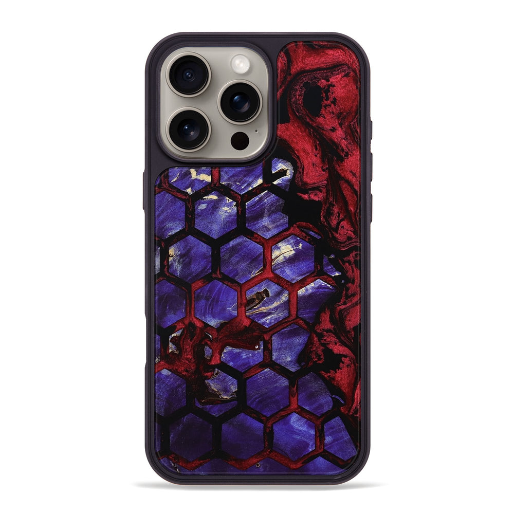 James has a striking pattern of hexagons in deep purple and hints of gold. The vivid red swirls add a bold contrast, creating a dynamic look.