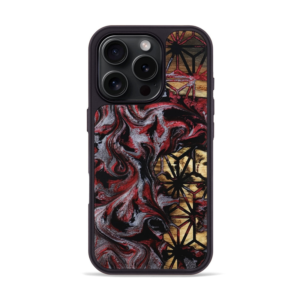 Coby is a vibrant piece of Buckeye wood with rich reds and blacks swirling together. It features a striking geometric pattern, creating a unique blend of natural beauty and design.